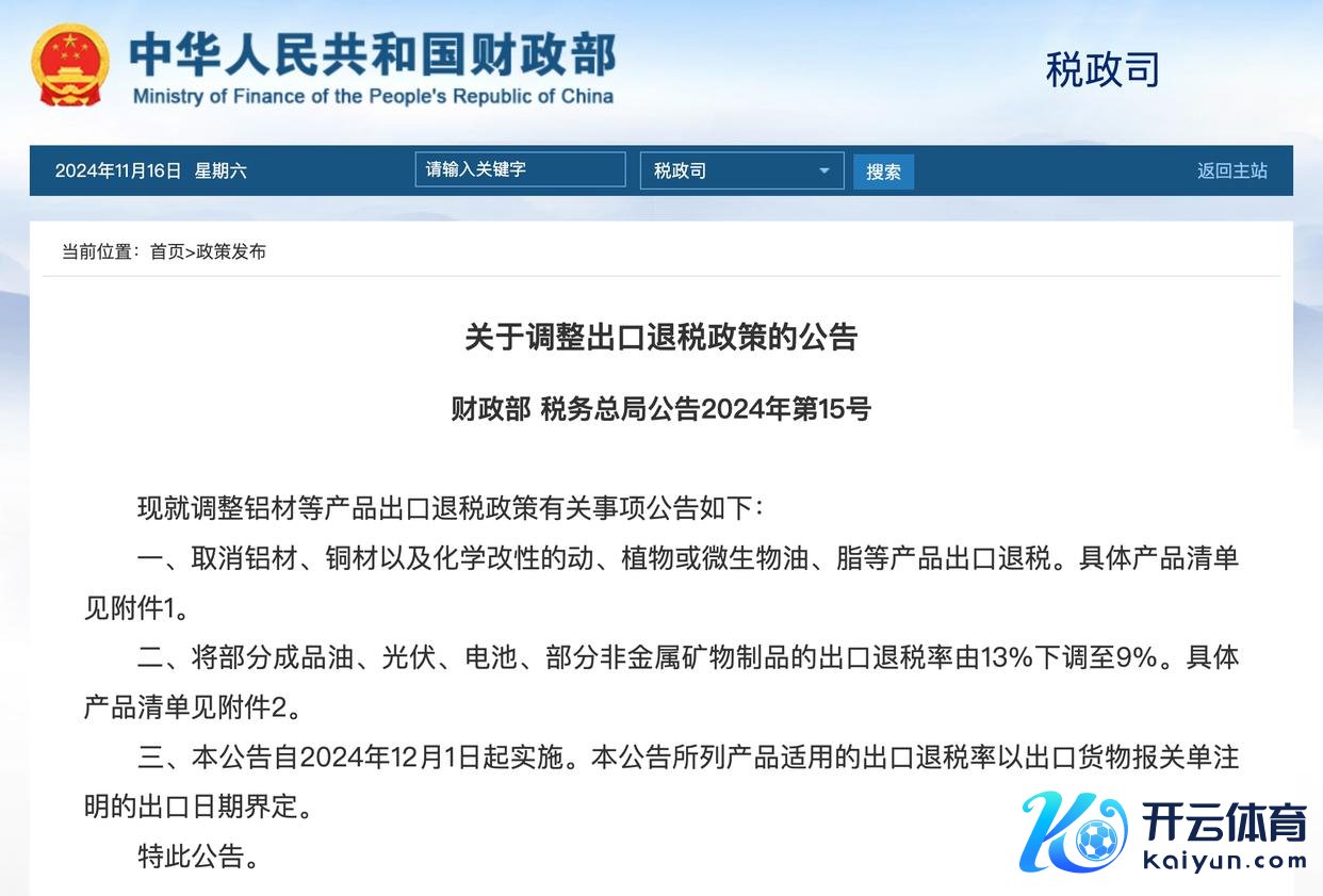 财政部、税务总局发布休养出口退税策略的公告袒露: 一、取消铝材、铜材以及化学改性的动、植物或微生物油、脂等居品出口退税。 二、将部分红品油、光伏、电板、部分非金属矿物成品的出口退税率由13%下调至9%。 公告自2024年12月1日起实验。以前很长一段时辰,为了保服务、稳增长,我们国度对外贸出口赐与了很大的援救,其中一个要紧技艺便是出口退税。说白了,便是国度从我方口袋里掏钱补贴出口企业,让它们的居品在国际市集上更有价钱竞争力。