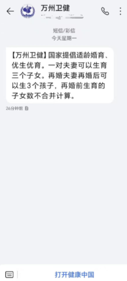 近日体育游戏app平台,有重庆万州区住户在酬酢平台示意,近期接连收到当地卫健委发送的群发短信,现实主要宣传生养战略。11月19日上昼,大皖新闻记者从万州区卫健委获悉,如实有群发两条短信,“主如若为了宣传新的生养战略。”