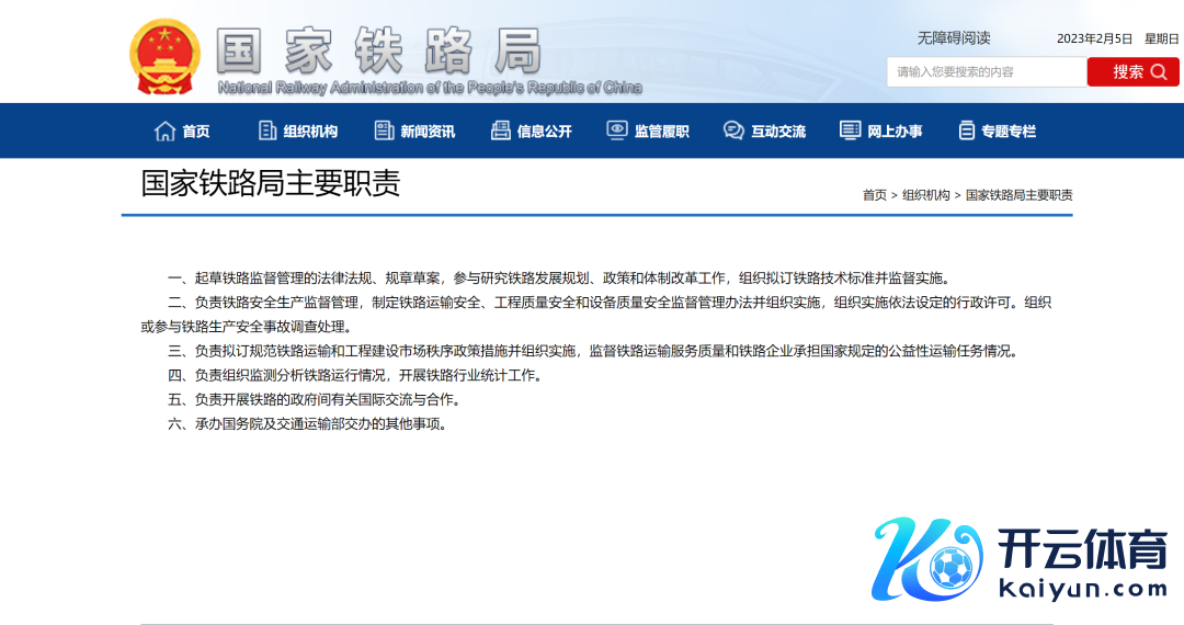 国度铁路局官网先容了主要职责,不错看放洋家铁路局主要负责拟订铁路时候圭臬、监督安全出产、运载服务质料、铁路脱手情况,对国度铁路集团的措置权限、措置范围相对较小,无权插手国铁集团最主要的运营职能。