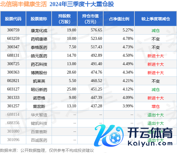 北信瑞丰健康生计为羼杂型-活泼基金,证明最新一期基金季报显现,该基金财富成就:股票占净值比94.27%,无债券类财富,现款占净值比5.21%。基金十大重仓股如下: