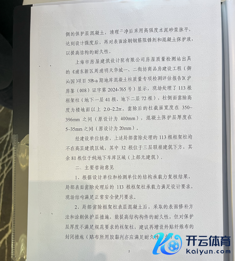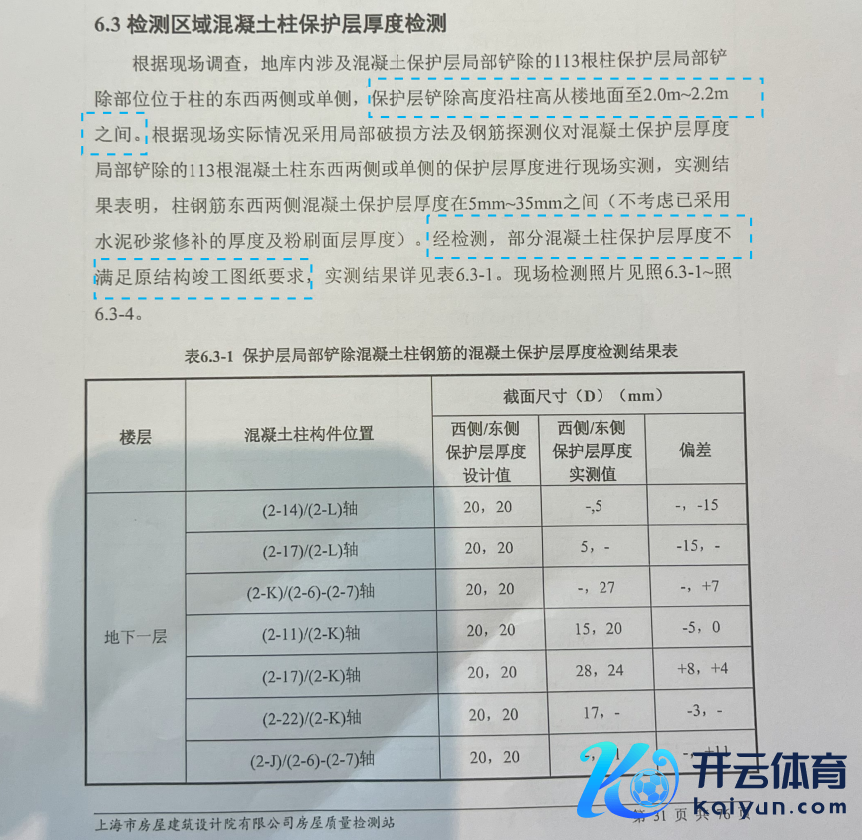 左证上海市房屋建筑联想院有限公司房屋质地检测站出具的房屋质地检测陈说,上海荣启置业有限公司(长实集团旗下公司,御沁园六期神态公司)因御沁园六期神态地库泊车位尺寸条目,对地库内11根混凝土柱东西两侧保护层进行局部断根,之后给与水泥砂浆进行修补。