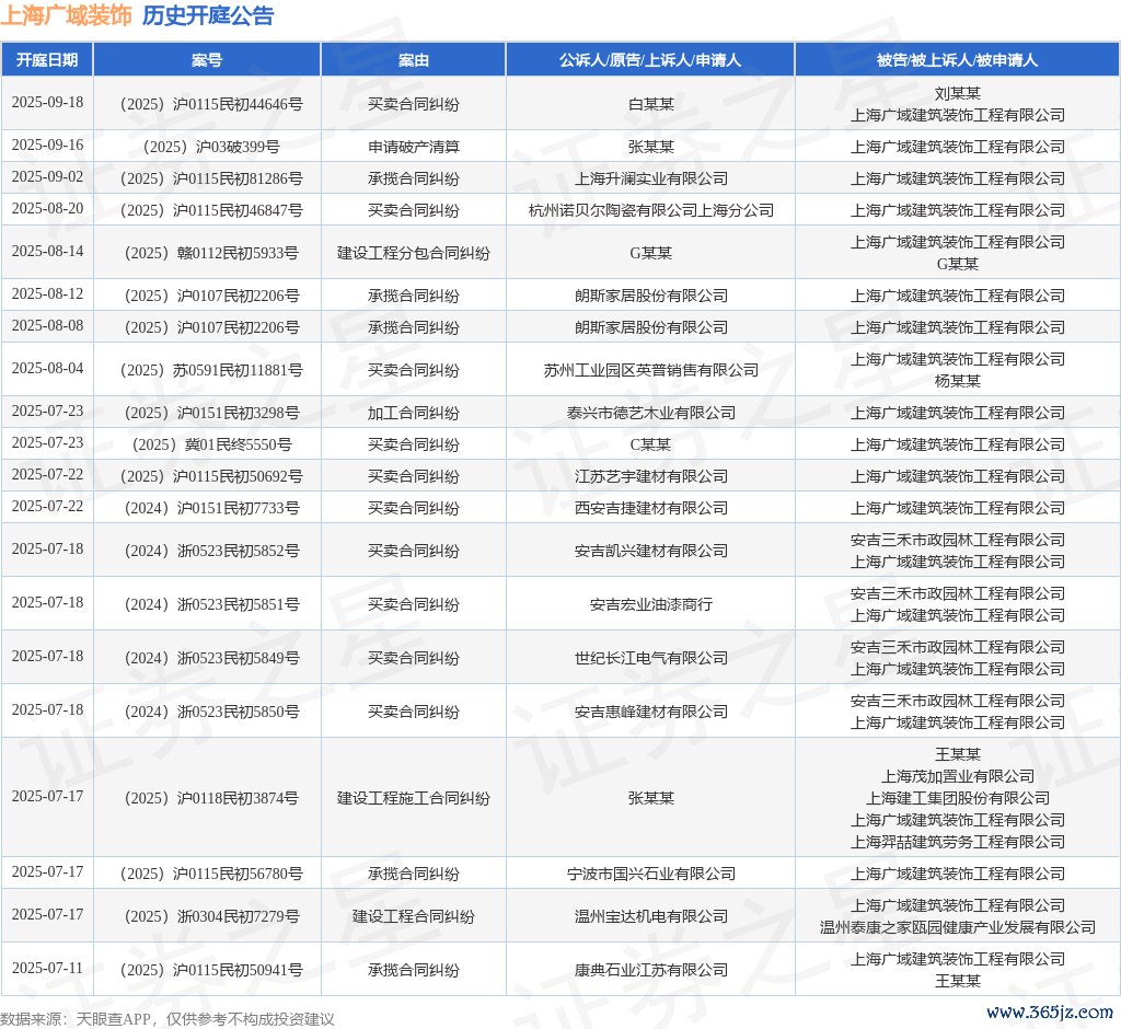 凭证统计,近一年内以上海广域建筑隐私工程有限公司为当事东说念主的历史开庭公告有215则,其中案由为“商业契约纠纷”的公告以75则居首,其次为“劳务契约纠纷”有39则,“修复工程分包契约纠纷”有24则。历史开庭公告(前20条)如下: